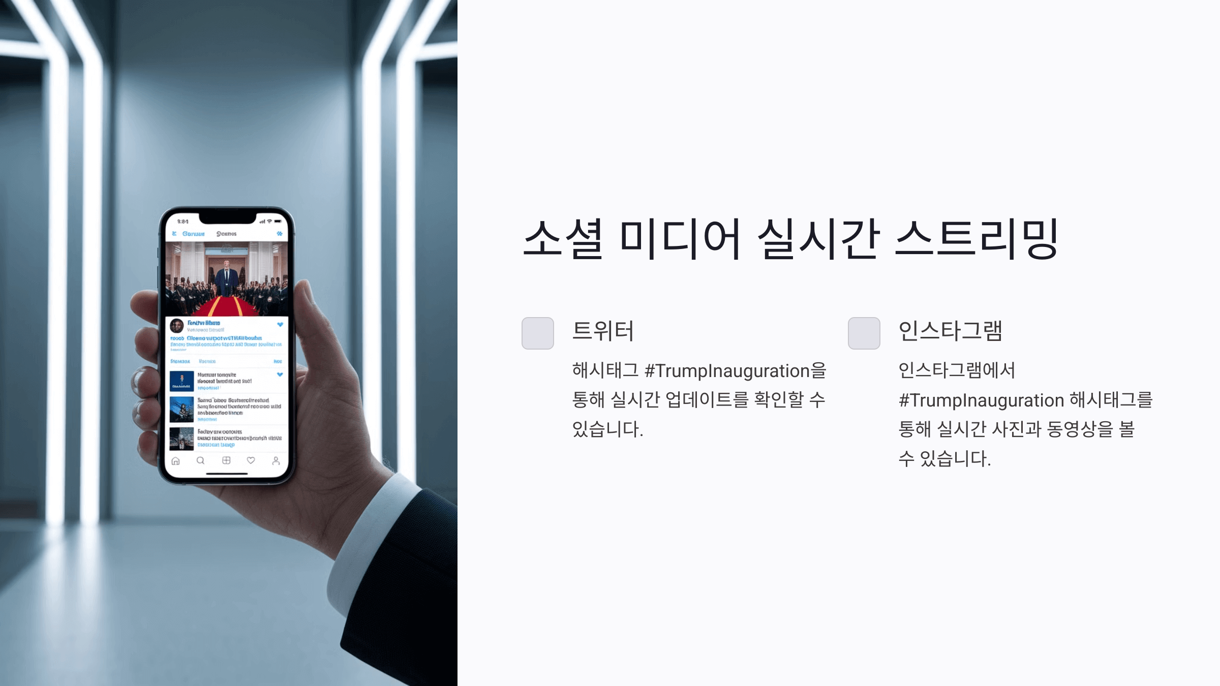 소셜 미디어 플랫폼은 도널드 트럼프 전 대통령의 취임식을 시청하는 새로운 방법을 제시했어요. Facebook, Twitter, Instagram과 같은 소셜 미디어는 백악관이나 주요 방송사의 공식 계정을 통해 실시간 스트리밍 서비스를 제공했답니다.